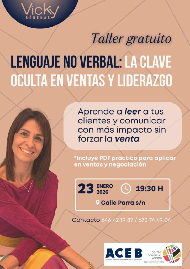 La sede de la Asociación de Comerciantes y Empresarios de Benalmádena (ACEB) y la Asociación Centro Comercial Abierto de Benalmádena (ACCAB) acogerán el taller gratuito «Lenguaje no verbal: la clave oculta en ventas y liderazgo», que será impartido por Vicky Ródenas, licenciada en Filología inglesa y especialista en comunicación efectiva, lenguaje corporal y educación. La formación se desarrollará el viernes 23 de enero, de 19:30 a 21:00 horas.