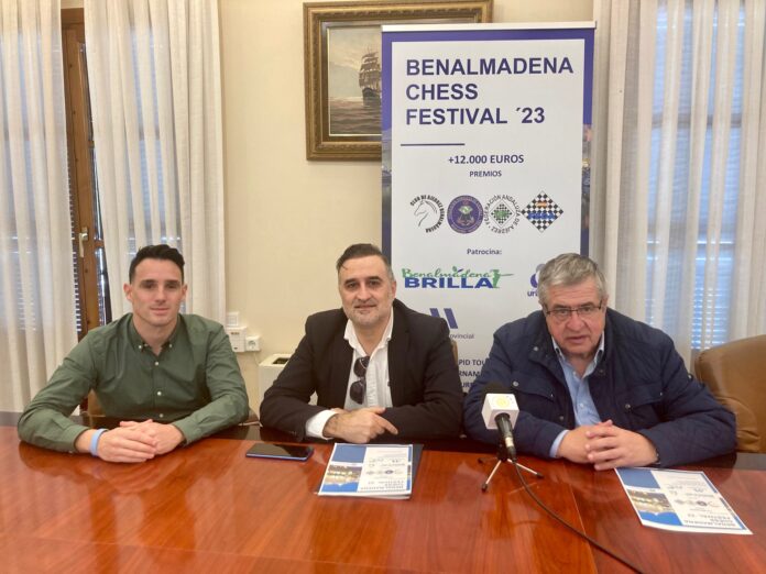 El concejal de Deportes, Joaquín Villazón, junto al presidente del Club Ajedrez Benalmádena, Daniel Hidalgo, ha presentado hoy la tercera edición del Benalmádena Chess Festival, que se desarrollará en el hotel Estival Torrequebrada del 25 al 28 de febrero.