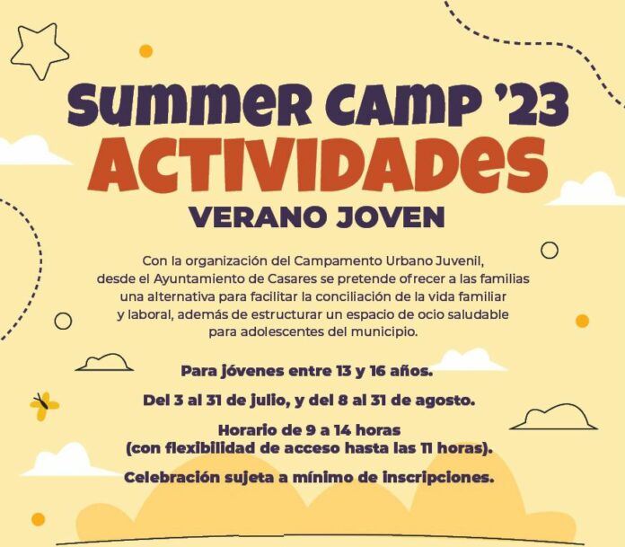 Summer Camp’23 es la nueva iniciativa del Ayuntamiento de Casares para complementar la Escuela de Verano. Un Campamento Urbano Juvenil que supone un espacio de ocio saludable para adolescentes de 13 a 16 años del municipio, al tiempo que ofrecer a las familias una nueva opción para facilitar la conciliación de la vida familiar y laboral.