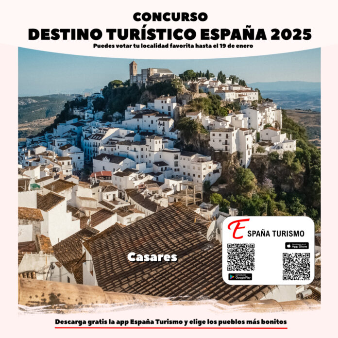 El municipio malagueño de Casares competirá desde esta noche a las 20:00 horas por el título nacional «Destino turístico España 2025» a través de la aplicación España Turismo, tras haber obtenido 4.922 votos que lo posicionaron como el pueblo más bonito de Andalucía. El municipio competirá junto a otros 16 pueblos seleccionados de todas las comunidades autónomas.