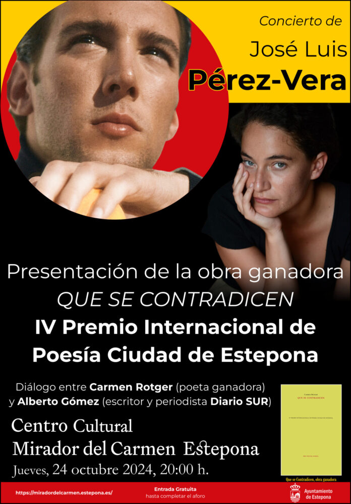 El próximo jueves 24 de octubre se presentará el poemario ‘Que se contradicen’, de la poeta Carmen Rotger, ganadora del Premio Internacional de Poesía ‘Ciudad de Estepona’, que está dotado con 6.000 euros y que ha sido publicado por la prestigiosa editorial Pre-Textos. El acto contará con la actuación del artista José Luis López-Vera.