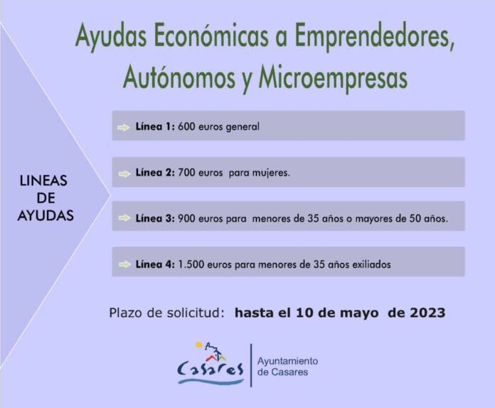 El Ayuntamiento de Casares destina 10.000 euros a las ayudas a emprendedores, favoreciendo la creación y puesta en marcha de microempresas, así como promoviendo el trabajo autónomo como alternativa al trabajo por cuenta ajena.