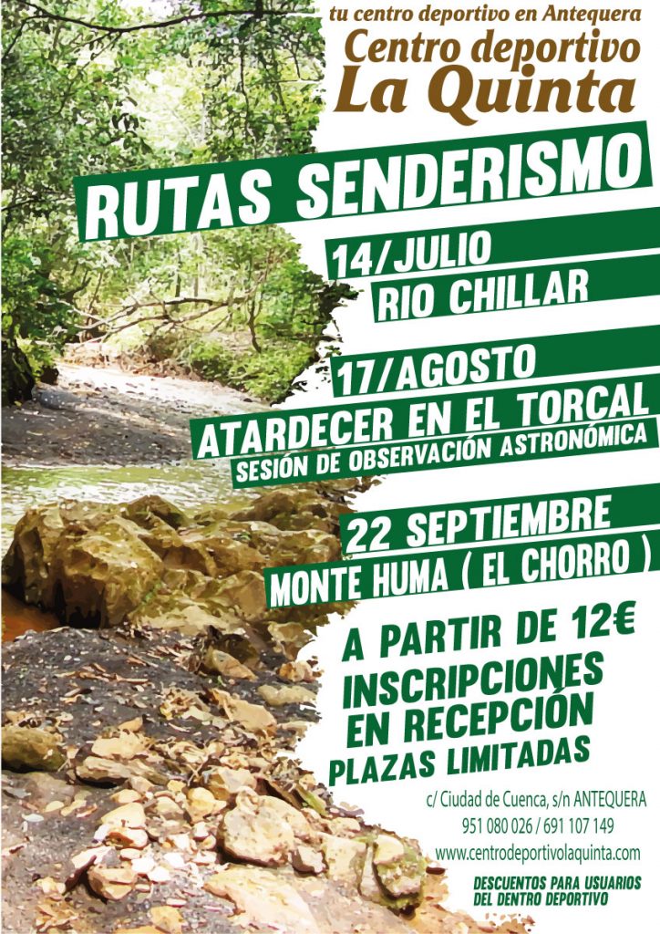 Las rutas, que tendrán como guías y monitores a personal especializado y propio del Centro Deportivo La Quinta, se realizarán en lugares emblemáticos considerados parajes naturales cercanos a la comarca de Antequera. Se llevarán a cabo así tres rutas, una por mes y, en este sentido, la primera ruta tendrá lugar el próximo 14 de julio en el Río Chillar situado en la población de Nerja. La siguiente Ruta se basará en una sesión de observación astronómica del atardecer en el Torcal de Antequera y la última, que cerrará así la temporada de verano, será al Monte Huma (El Chorro) el próximo 22 de septiembre.