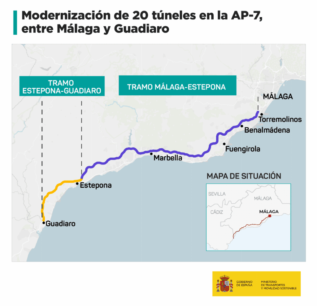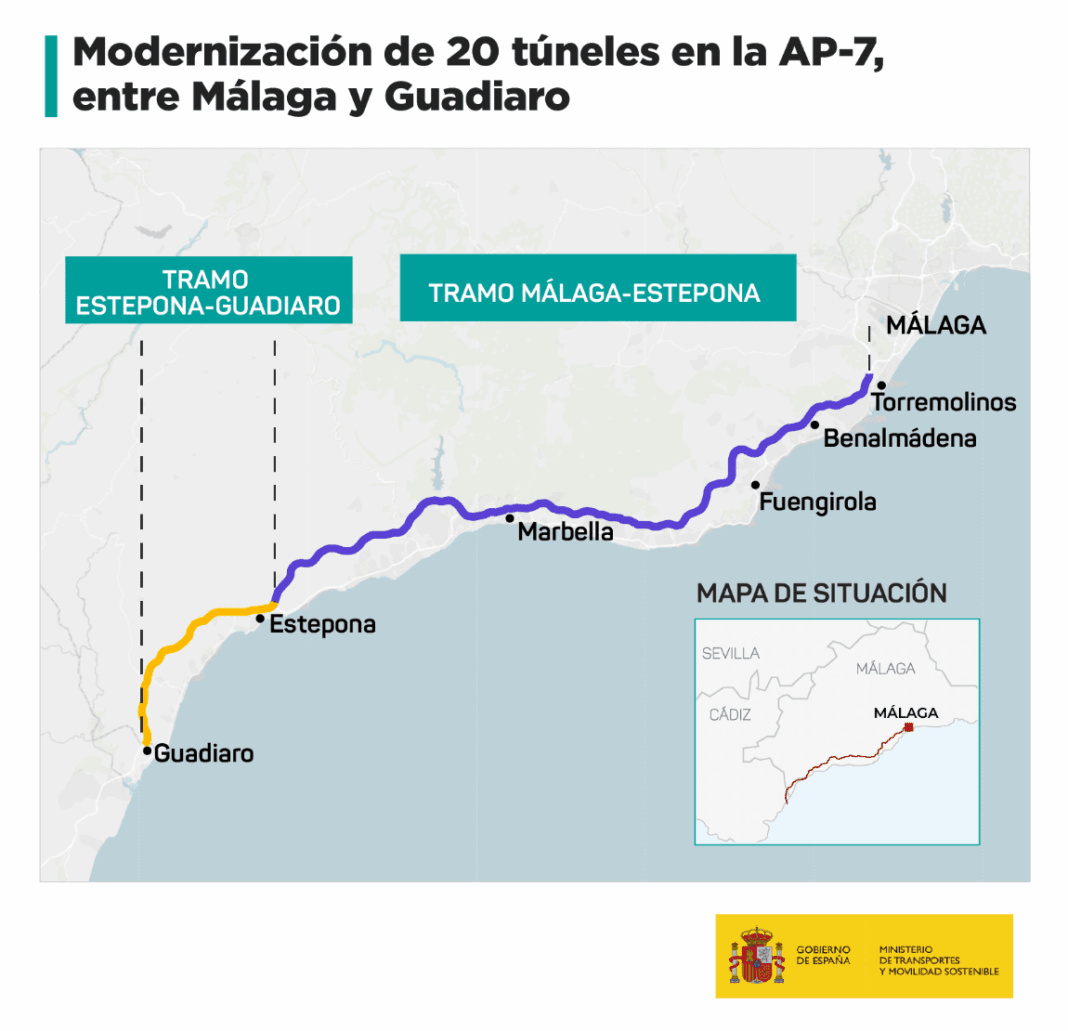 El Consejo de Ministros ha aprobado un Real Decreto por el que se modifican las concesiones de la Autopista AP-7 de la Costa del Sol para reconocer una inversión de 42,6 millones de euros en la adecuación de 20 túneles entre Málaga y Guadiaro. El Ministerio de Transportes y Movilidad Sostenible sufragará la inversión mientras que la Sociedad Concesionaria asume el coste de redacción de los proyectos y los costes de conservación y explotación hasta el final de la concesión. Las obras se han ejecutado en los tramos Málaga-Estepona y Estepona-Guadiaro en una longitud cercana a los 12 kilómetros.