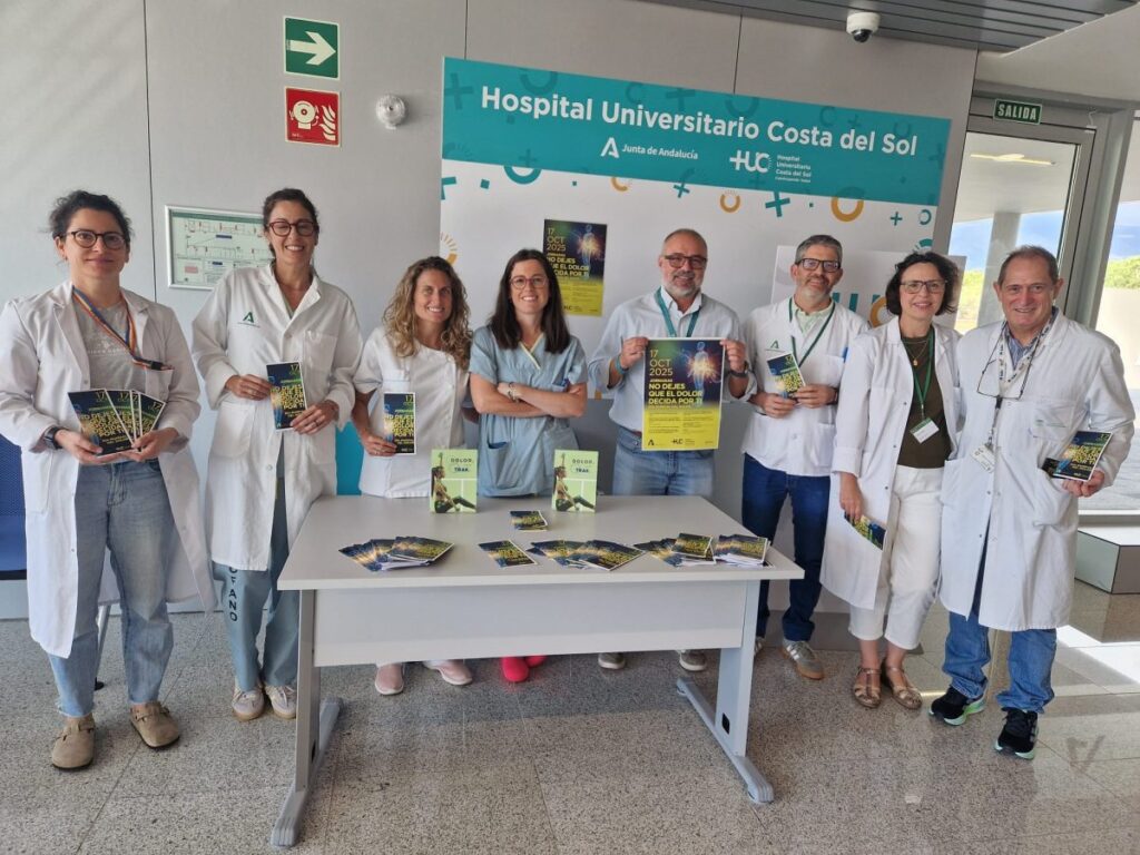 El Hospital Universitario Costa del Sol celebra el 17 de octubre la jornada «No dejes que el dolor decida por ti» con motivo del Día Mundial sin Dolor. La Unidad del Dolor del servicio de Anestesiología y Reanimación organiza la actividad con el objetivo de sensibilizar sobre el manejo integral del dolor crónico mediante un abordaje que incorpora aspectos psicológicos, nutricionales y ejercicio físico, más allá del tratamiento farmacológico. La jornada está dirigida a profesionales sanitarios, pacientes, familiares y ciudadanía en general, con sesiones que se desarrollan en el salón de actos, talleres prácticos y una mesa informativa en el hall principal del nuevo edificio del centro hospitalario.