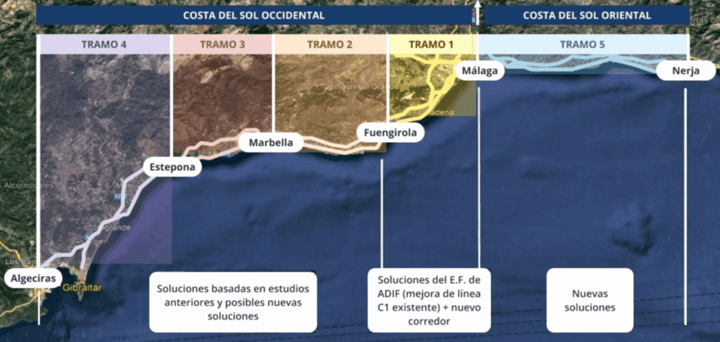 El estudio se estructura en cinco tramos estratégicos: Málaga-Fuengirola, Fuengirola-Marbella, Marbella-Estepona, Estepona-Algeciras y Málaga-Nerja. Esta configuración permitirá llevar los beneficios del transporte ferroviario a la ciudadanía que reside en toda la Costa del Sol, expandiendo el servicio a municipios densamente poblados como Estepona y Marbella.