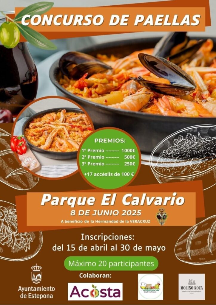 El Ayuntamiento de Estepona organizará el domingo 8 de junio el primer Concurso de Paellas en el Parque Municipal El Calvario a beneficio de la Hermandad del Santísimo Cristo de la Vera+Cruz. El evento pretende fomentar la cultura gastronómica de la ciudad y la tradición de los arroces, así como dar a conocer la calidad de los productos de proximidad.