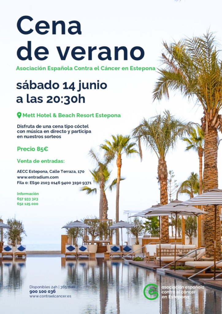 La Asociación Española Contra el Cáncer en Estepona organizará su primera Cena Solidaria de Verano el viernes 14 de junio a las 20:30 horas en el Mett Hotel & Beach Resort. El evento busca recaudar fondos para mantener los servicios gratuitos que la entidad ofrece a pacientes y familiares que conviven con el cáncer en la localidad.