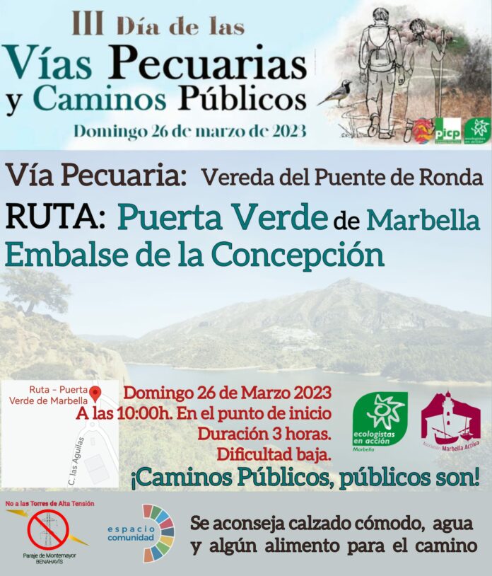Ecologistas en Acción Marbella organiza el próximo domingo 26 de marzo de 2023, una actividad con motivo del III Día de las Vías Pecuarias y los Caminos Públicos. Una iniciativa de la Plataforma Ibérica por los Caminos Públicos (PICP), la Federación Española de Deportes de Montaña y Escalada (FEDME) y Ecologistas en Acción.