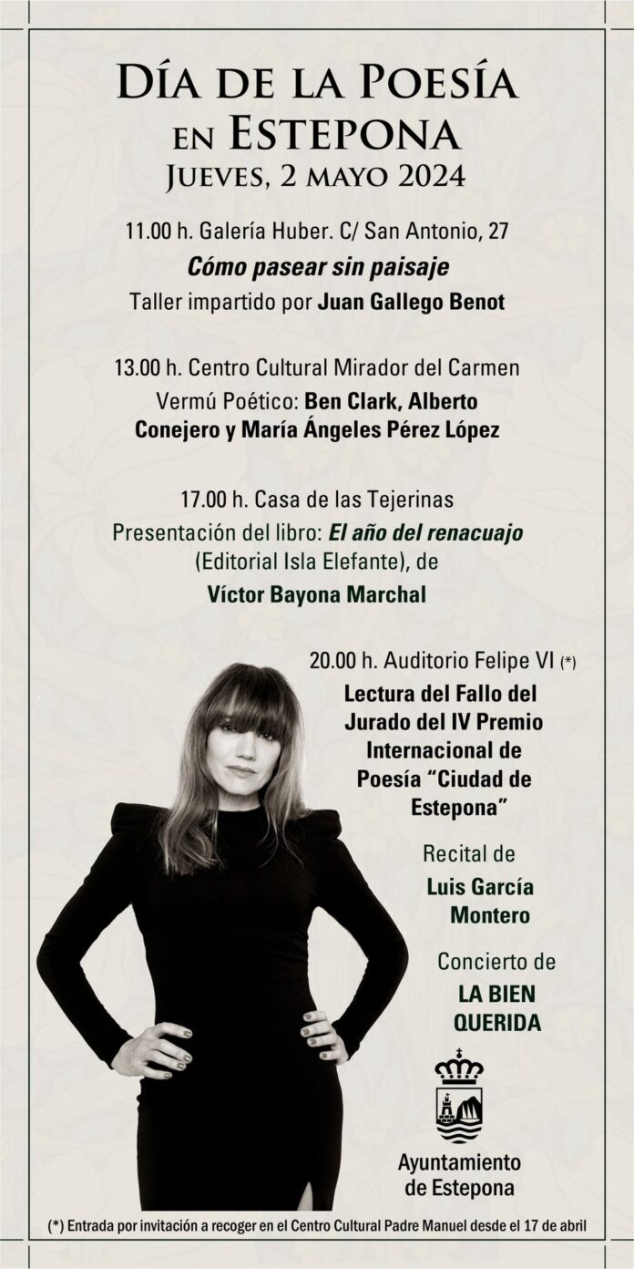 20:00 horas, Auditorio Felipe VI: Lectura del Fallo del Jurado del IV Premio Internacional de Poesía ‘Ciudad de Estepona’. Recital de Luís García Montero. Concierto de La Bien Querida. El poemario ganador recibirá 7.000 euros y será publicado por Pre-Textos.