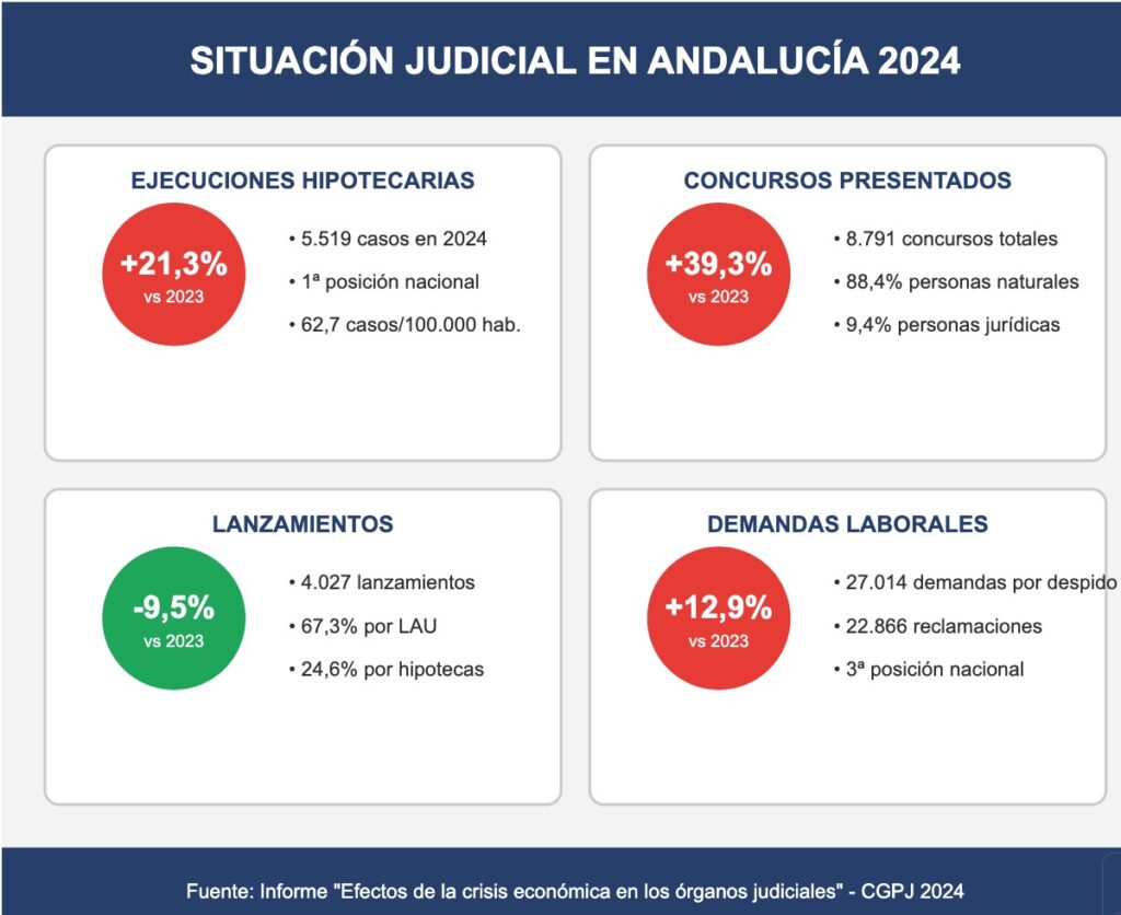 Las ejecuciones hipotecarias iniciadas en Andalucía durante 2024 experimentaron un incremento del 21,3% respecto al año anterior, rompiendo la tendencia a la baja que mantenían desde 2022. Los tribunales andaluces registraron 5.519 ejecuciones hipotecarias durante el pasado ejercicio, según revela el informe «Efectos de la crisis económica en los órganos judiciales» publicado por la Sección de Estadística del Consejo General del Poder Judicial.
