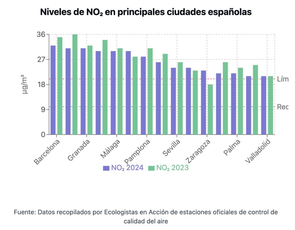 Barcelona (Eixample), Madrid (Plaza Elíptica) y Granada Norte registraron los niveles más altos, con concentraciones medias anuales iguales o superiores a 30 microgramos por metro cúbico, superando el límite de 20 microgramos que deberá alcanzarse antes de 2030. Estas cifras también exceden significativamente los 10 microgramos recomendados por la Organización Mundial de la Salud.