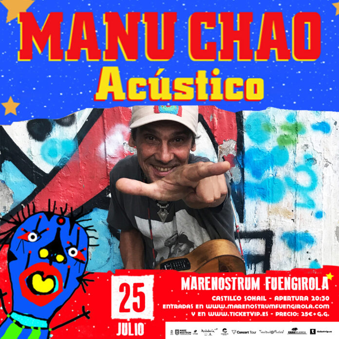 Marenostrum Fuengirola recibirá, el próximo 25 de julio, una de las actuaciones que Manu Chao realiza de forma esporádica. El recinto fuengiroleño será testigo del talento musical del artista a solas con su guitarra, en un formato acústico donde la sintonía con su público se hará visible dentro de escenario Fundación Unicaja / castillo Sohail. El cantante de origen franco español, que canta en multitud de idiomas, interpretará algunas de sus canciones más conocidas como “Me Gustas Tú” o “Bongo Bong”.