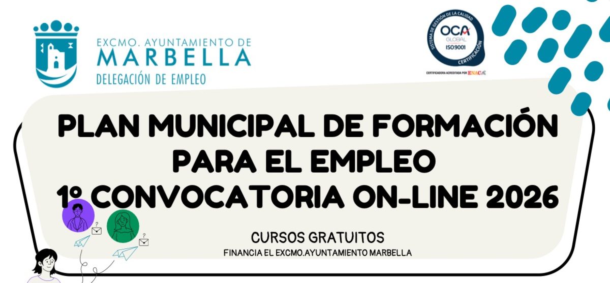 La Delegación de Empleo del Ayuntamiento de Marbella ha abierto el plazo de inscripción para la primera convocatoria de formación online de 2026. Se ofertan un total de 720 plazas gratuitas distribuidas en 24 especialidades, que abarcan sectores como ofimática, TIC, diseño web, prevención de riesgos laborales y protección de datos.