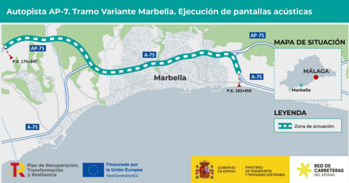 El Ministerio de Transportes y Movilidad Sostenible ha formalizado por 13,1 millones de euros (IVA incluido) las obras para instalar pantallas acústicas en la variante de Marbella de la Autopista de la Costa del Sol (AP-7). Los trabajos, que se ejecutarán entre los kilómetros 175,347 y 183,45 de la autopista a su paso por la provincia de Málaga, se enmarcan en el desarrollo del Plan de Acción contra el ruido en la Fase II.